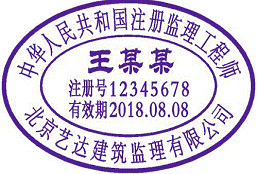 (一)中华人民共和国注册监理工程师执业印章印模颜色为紫色。由:中华人民共和国注册监理工程师、姓名、注册号、有效期和聘用企业名称五部分组成。
